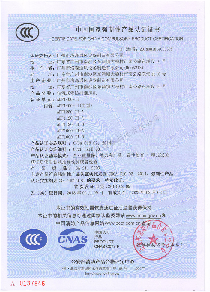 • CCCF證書-洛森風機180314軸流式消防排煙風機ADF1400-II(ADF1400-II~ADF1000-II-B)